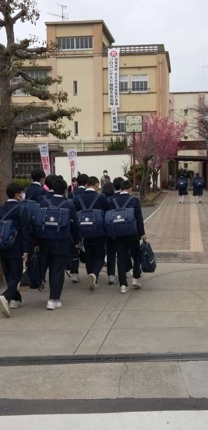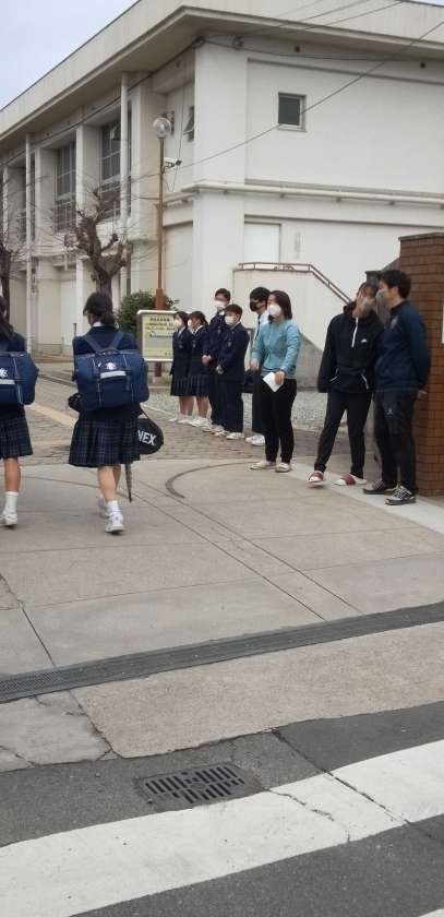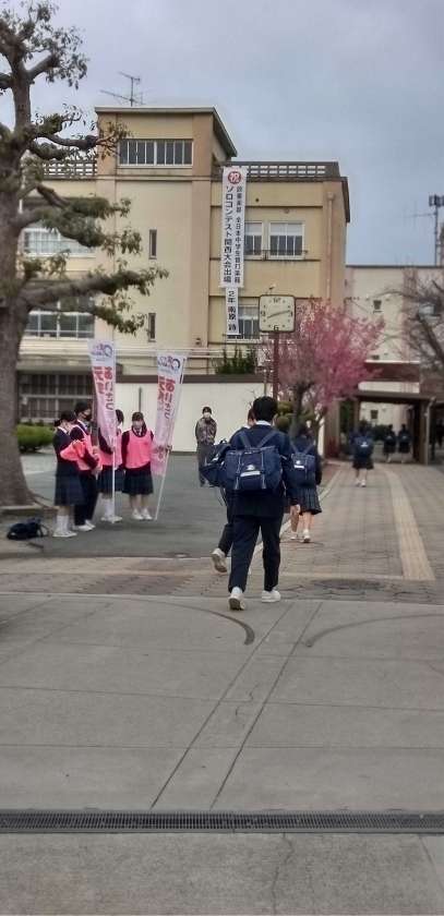 曇り空の中、生徒たちが元気に登校して来ました。