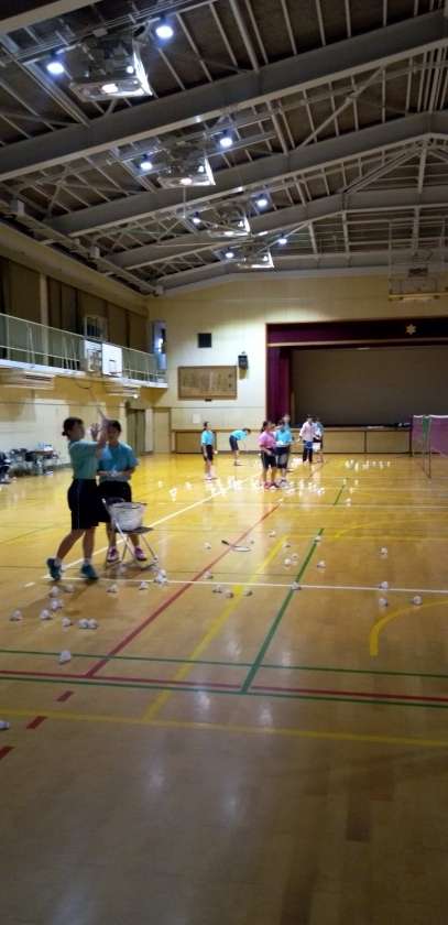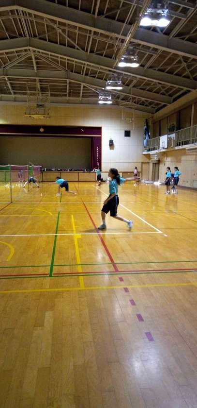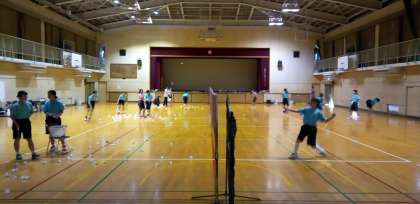 体育館では、バドミントン部が汗を流しています。