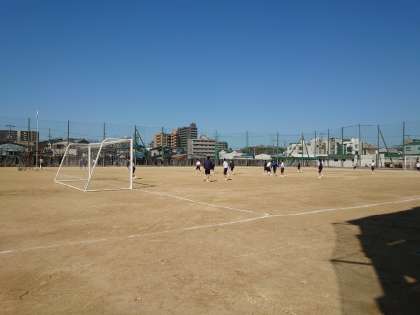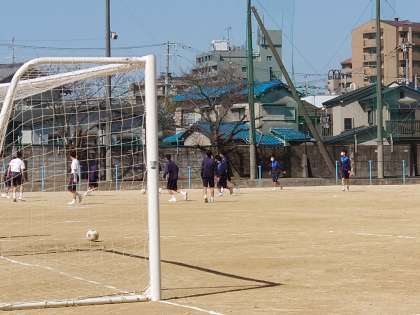 男子は、グラウンドでサッカーに取り組んでいます。仲間と協力して、ボールをゴールに運びます。