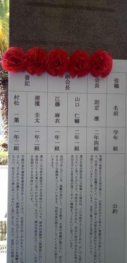 先週の生徒会役員立ち会い演説会、選挙の結果、新しいメンバーが決定しました。