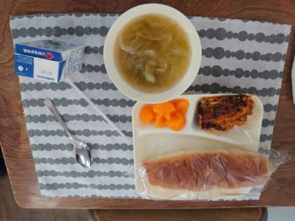 パン、牛乳、じゃがいものミートグラタン、レタスのスープ、みかん(缶)
