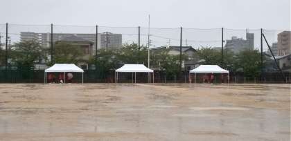 公式戦のサッカー部。準備だけでずぶ濡れ! 大変です。