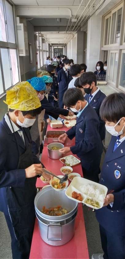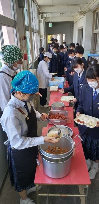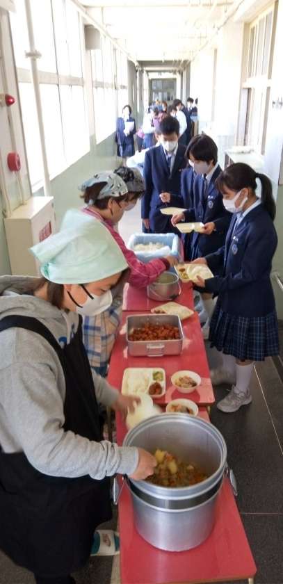 午前中の授業が終了し、給食の準備に入りました。