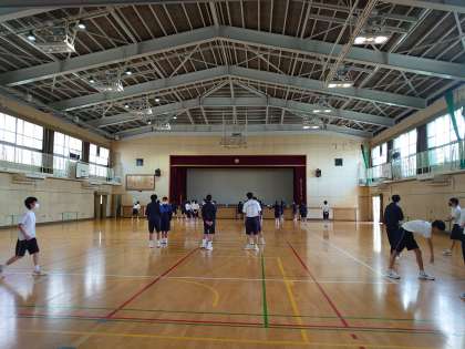 ラジオ体操に取り組んでいます。グループごとに分かれて、それぞれ細かい部分をみんなで確認しながら取り組んでいます。