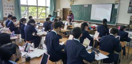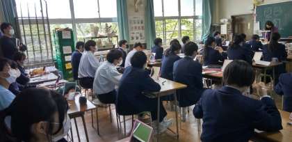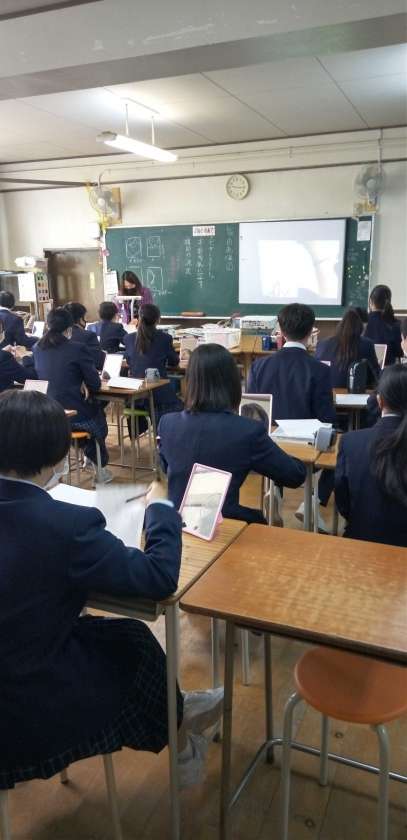 書画カメラを使い、映像でわかりやすく、描き方を説明しています。