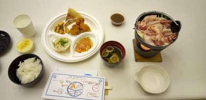 牛すき焼き、海自カレー、鶏肉唐揚げ、音戸のちりめんピザ、広島お好みソースかけポテト、瀬戸内お刺身バジルソースかけ、呉細うどん、呉ますやみその味噌汁、広島産あきさかりご飯、そして、瀬戸内レモンプリンです!