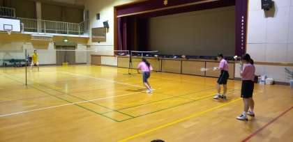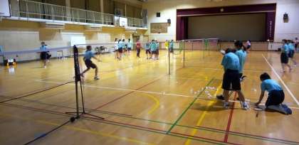 体育館では、バドミントン部が汗を流しています。