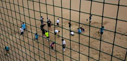 明日の体育大会学年練習に向けて、ラグビー部・サッカー部の諸君が整地活動を。