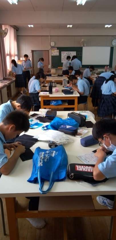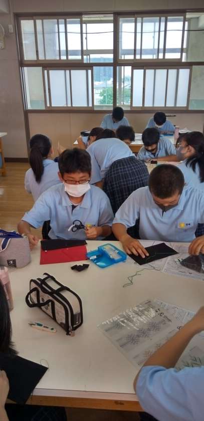 家庭科の授業、被服室でスウェーデン刺繍の実習です。