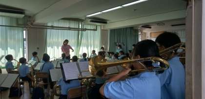 グラウンドでは、大会をひかえたソフトボール部、野球部が、音楽室では、コンクール前の吹奏楽部が練習に励んでいます。
