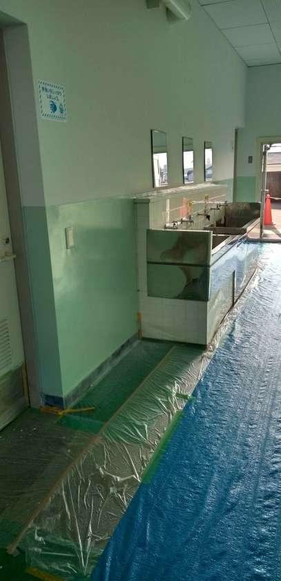 管理作業員さんの手によって、廊下や手洗い場の壁が、とても美しくなりました。