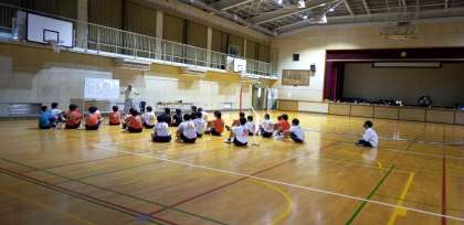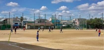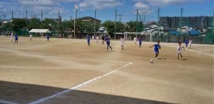 猛暑の中、グラウンドではラグビー部、サッカー部が、体育館では、男子バレーボール部が練習しています。
