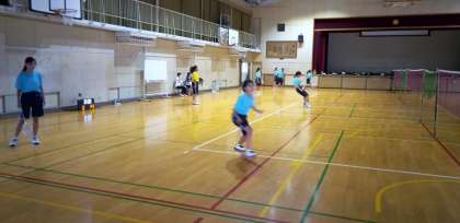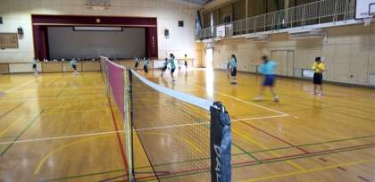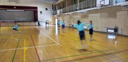体育館では、バドミントン部が汗を流しています。