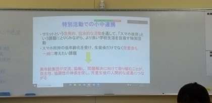 集団活動に自主的、実践的に取り組み、生活上の課題を解決する特別活動として基調提案があり、大阪市スマホサミットの取り組みが発表されました。