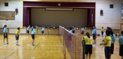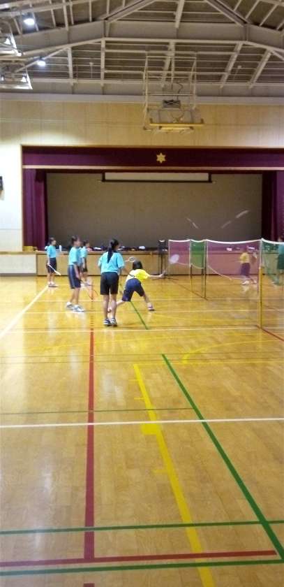 体育館では、バドミントン部が練習を行っています。