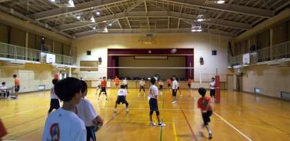 体育館では、男子バレーボール部が練習しています。