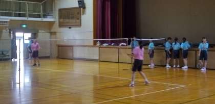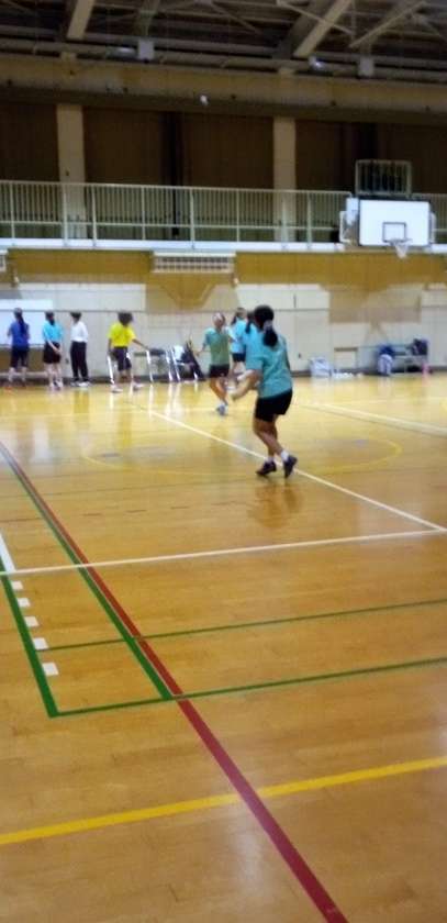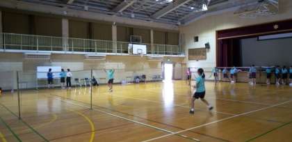 体育館では、バドミントン部が汗を流しています。