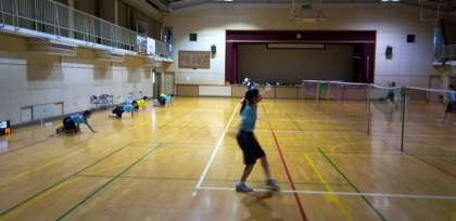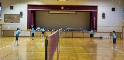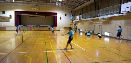 体育館では、バドミントン部が汗を流しています。