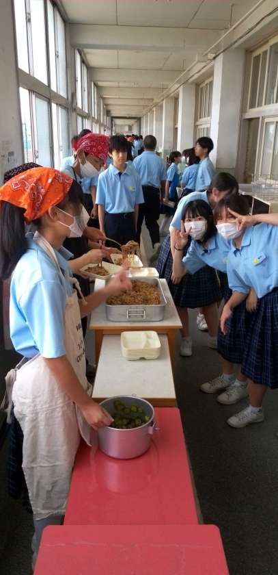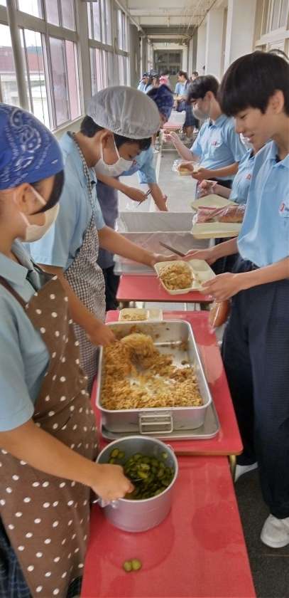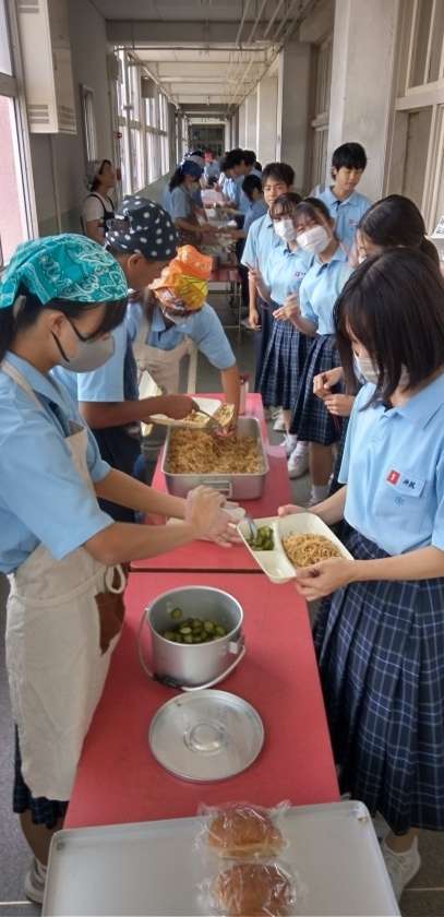 今日のメニューは、「焼きそば」「きゅうりの生姜づけ」「芋ケンピ&フィッシュ」に黒糖パンです。