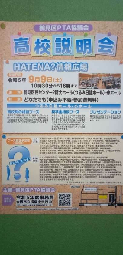 今週の土曜日、鶴見区民センターで、PTA主催の高校説明会が行われます。