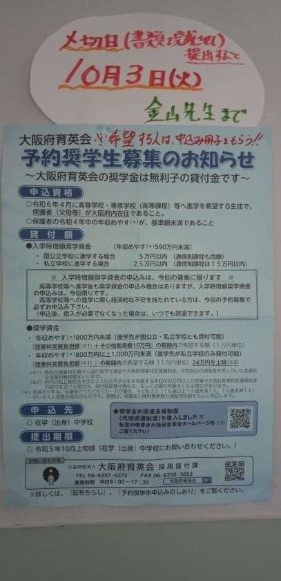大阪府育英会の奨学金制度の締め切りが迫っています。