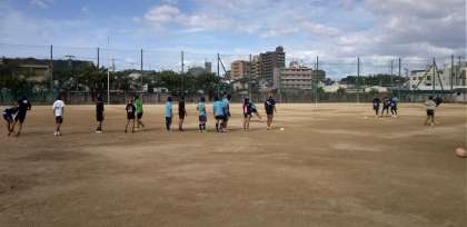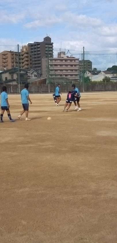 グラウンドでは、ラグビー部が練習しています。