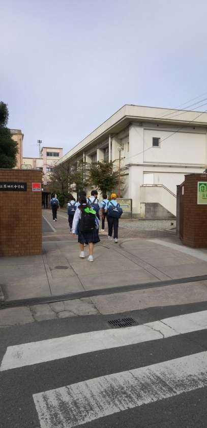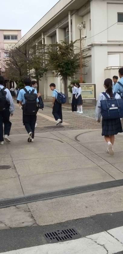 曇り空のもと、生徒たちが元気に登校して来ました。