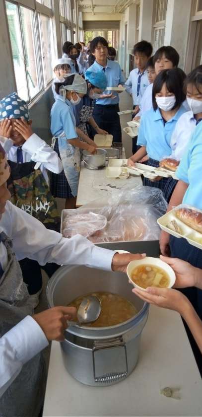 午前中の授業が終わって、給食の準備に入りました。