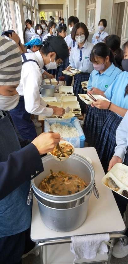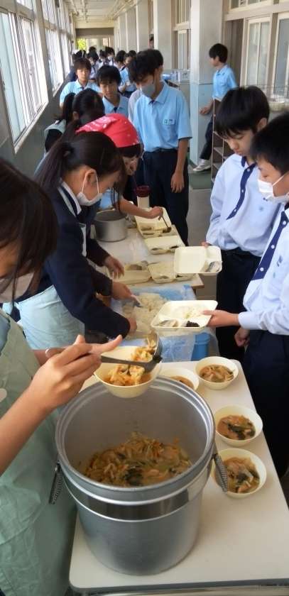 係生徒の皆さん、手洗いうがい、マスク着用で配膳をお願いします。