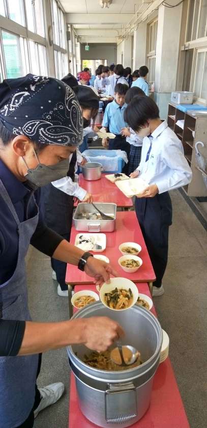 午前中の授業が終わって、給食の準備に入りました。
