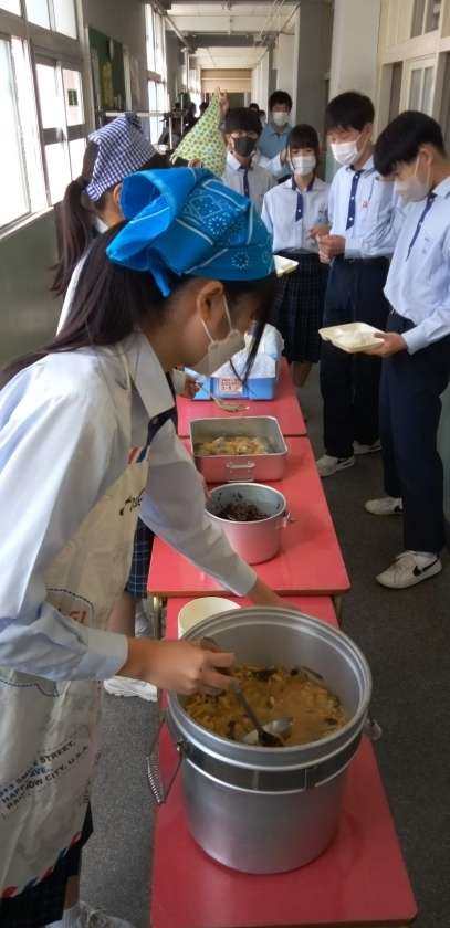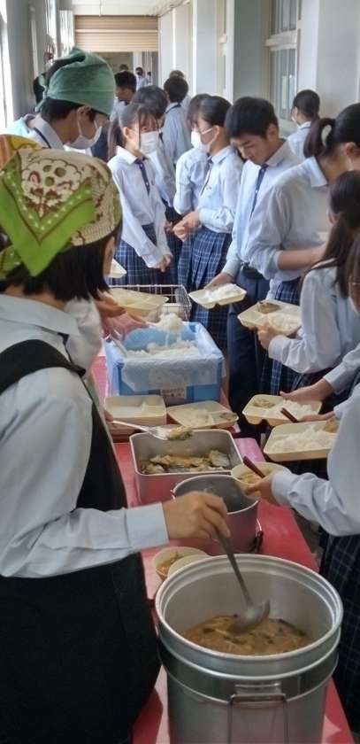 野菜の味噌汁、給食の横綱さごしと、いただきます。
