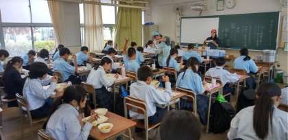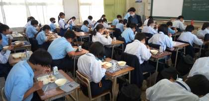 午前中の授業が終わって、給食の準備を終え、いただきます!