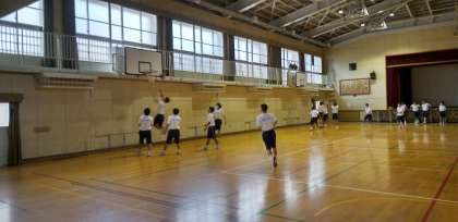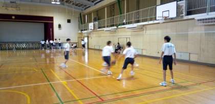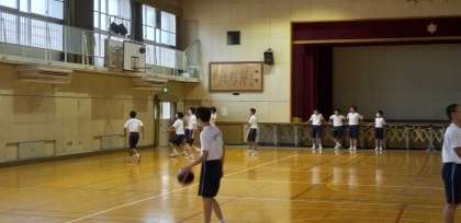 体育館で、バスケットボールの授業です。
