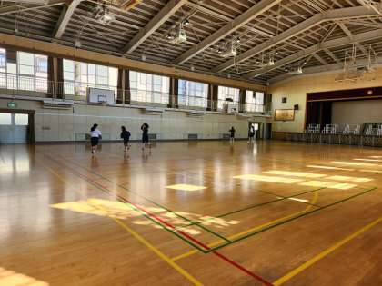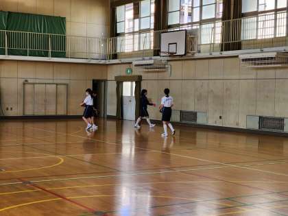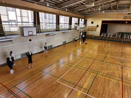 球技に取り組んでいます。ゴール型スポーツとして、バスケットボールに取り組んでいます。シュート、パスの技術を磨き、実戦に近い練習へとつないでいます。