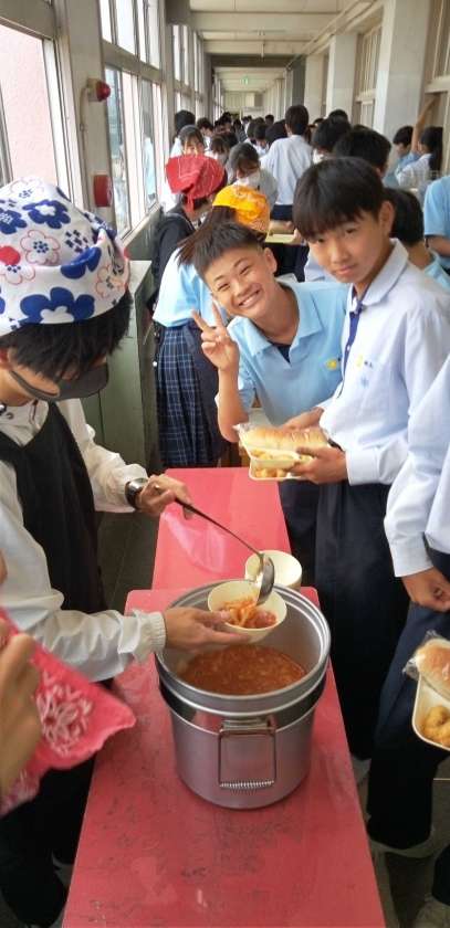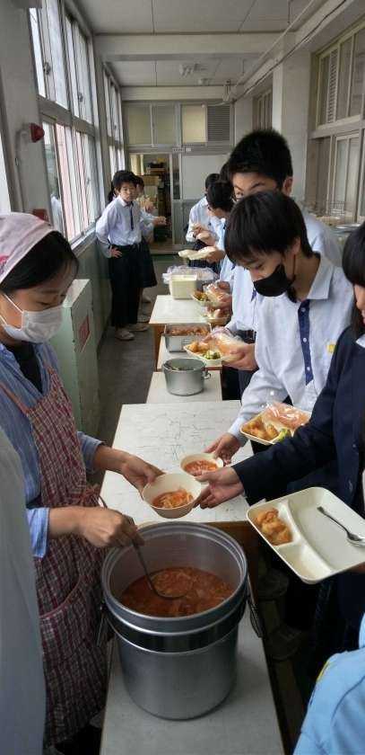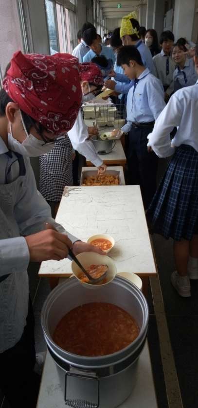 午前中の授業が終わって、給食の準備に入りました。