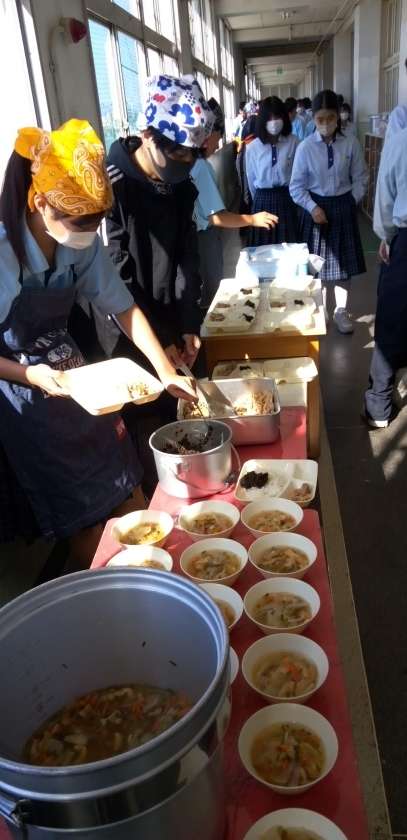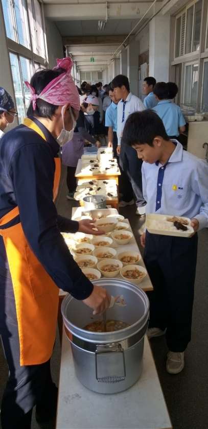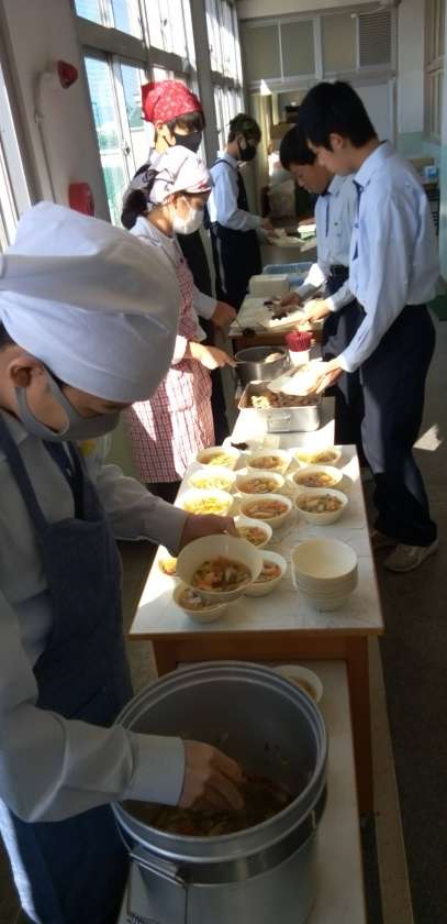 午前中の授業が終わって、給食の準備に入りました。