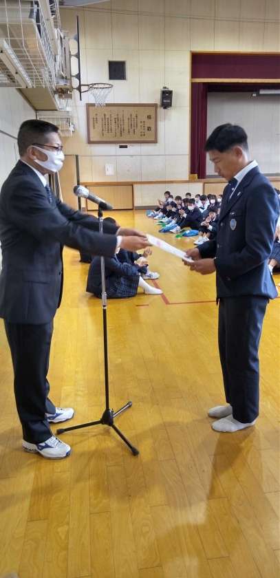 ラグビー部のキャプテンに、みんなの模範となる優秀選手の表彰がありました。