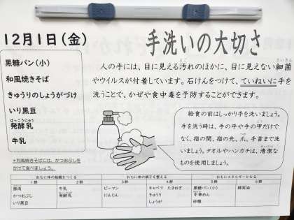 給食の前はしっかり手を洗いましょう。手を洗うときは、手の平や手の甲だけでなく、指の間、指の先、爪、手首まで洗いましょう。タオルやハンカチは、清潔なものを使用しましょう。