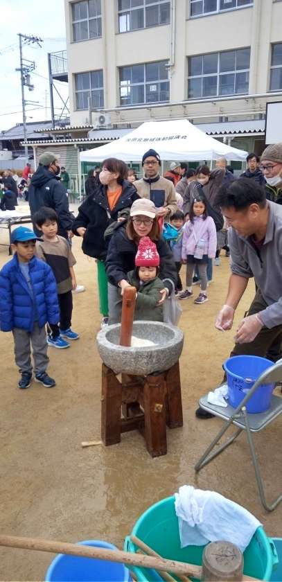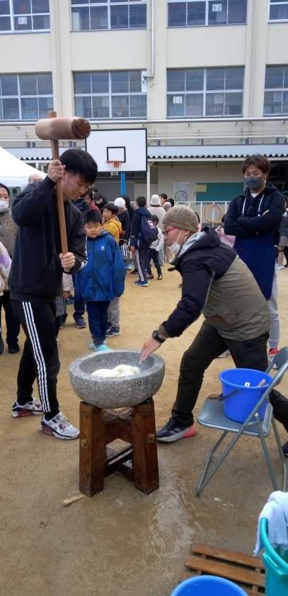 臼と杵のつく音が、校庭に響きます!