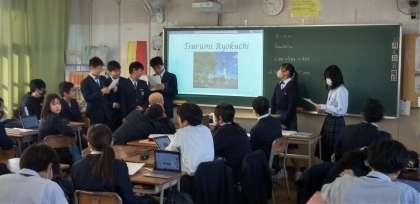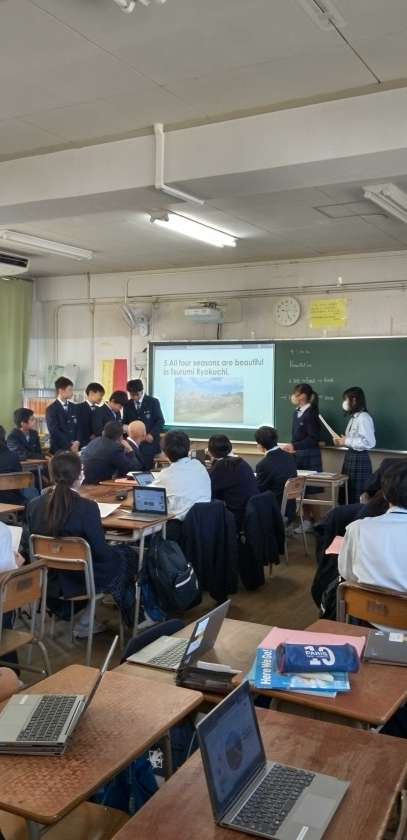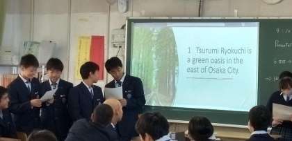 タブレットとパワーポイントを駆使し、英会話力を発揮して、鶴見緑地の魅力を発表しています。