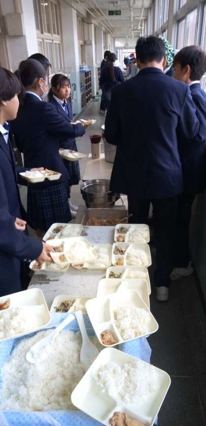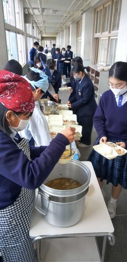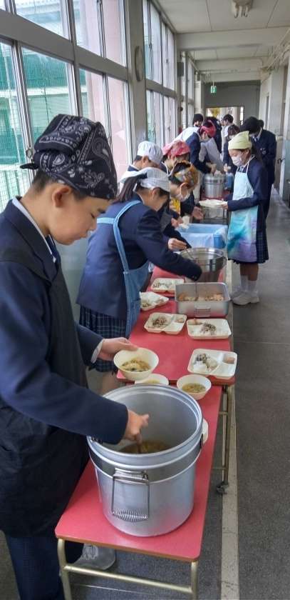 午前中の授業が終了し、給食の準備に入りました。