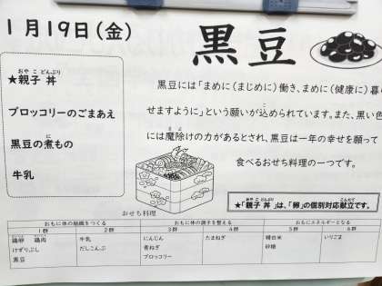 親子丼、ブロッコリーのごまあえ、黒豆の煮もの、牛乳