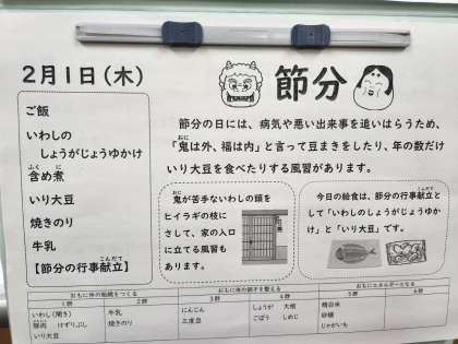 今日の給食は、節分の行事献立として「いわしのしょうがじょうゆかけ」と「いり大豆」でした。