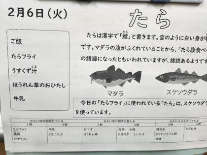 たらは感じで「鱈」と書きます。雪のように白い身が特徴です。マダラの腹がふくれていることから、「たら腹食べる」の語源になったともいわれていますが、諸説あるようです。