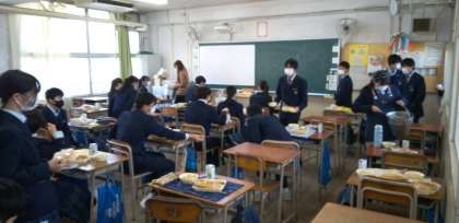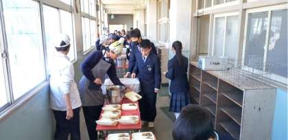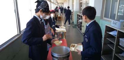 本日の給食メニューは「とろろ入りなにわうどん」「豚肉と野菜の煮物」「棒チーズ」。