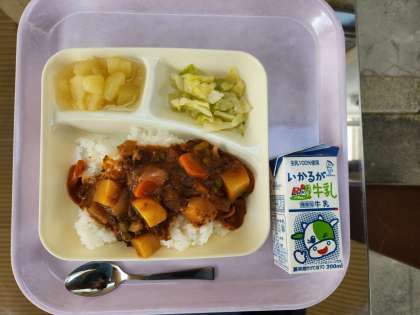 ハヤシライス、キャベツのバジル風味サラダ、洋ナシ(カット缶)、牛乳