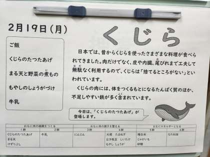 くじらの肉には、身体を作るもとになるたんぱく質のほか、不足しやすい鉄が多く含まれています。