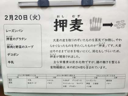 レーズンパン、押し麦のグラタン、豚肉と野菜のスープ
