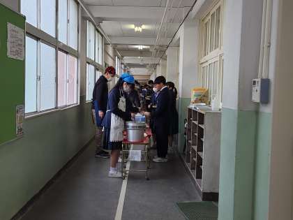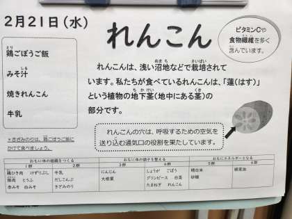 本日の献立は、鶏ごぼうご飯、みそ汁、焼きれんこん、牛乳でした。