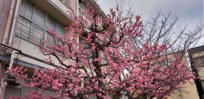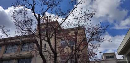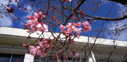 本日、満開の紅梅に続いて、体育館横の寒緋桜が開花しました!